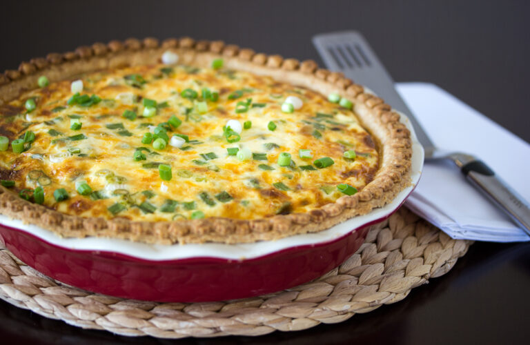 - Roll out the pastry on a lightly floured surface and use it to fit a 10″ / 25 cm quiche or tart pan. Spread the asparagus and half of the bacon and cheese over the pastry. Add the egg mixture, pouring it through a fine sieve. Sprinkle remaining bacon and cheese over the top.