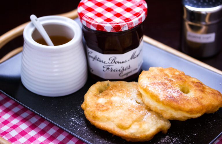 - Oil your hands and take a handful of the dough. Stretch it with your fingers to form a thin layer, and put in the saucepan. Fry until golden brown, turning halfway. Take out and put on tissue paper to drain the excess oil. Serve hot, sprinkled with confectioners sugar, with jam, honey or chocolate spread.