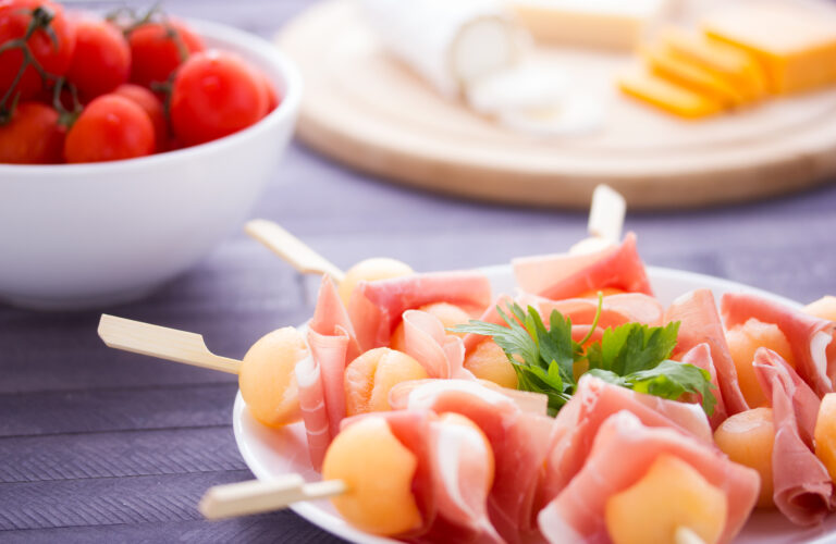 - Thread a melon ball on a skewer, followed by a strip of prosciutto, another melon ball and so on. Repeat with more skewers and the remaining ingredients.