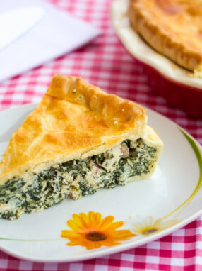 This pie is full of veggies, bacon and cheese, sealed up in crispy double crust. Yummy!