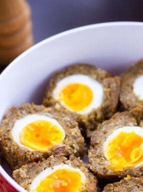 This vegetarian version of scotch eggs uses spiced chickpeas. Easy and delicious.