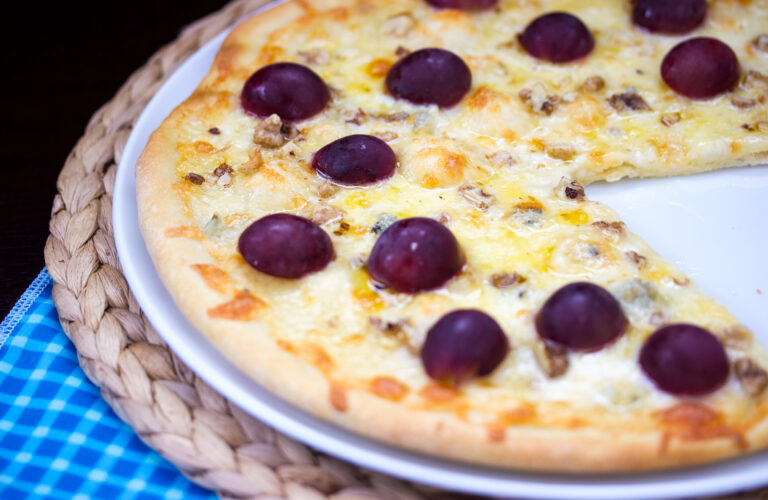 Wonderful rich cheesy pizza paired perfectly with grapes and walnuts. What a fantastic combination!