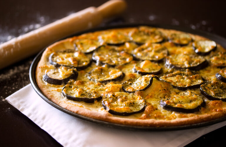 - On a floured surface, roll out dough to ½ ” / 1 cm thickness. Transfer into a pizza pan or baking sheet, lined with baking paper. Brush dough with half the oil and sprinkle with half the cheese. Layer on eggplant, top with the rest of the oil, cheese and oregano. Bake for 20 mins, until pizza edges are golden.