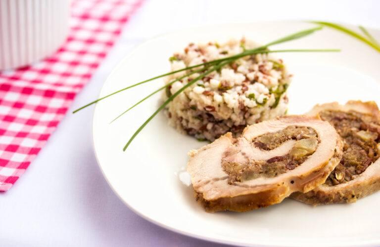 - Take roll out of the foil, remove kitchen twine and slice. Serve with the sauce and wild rice.