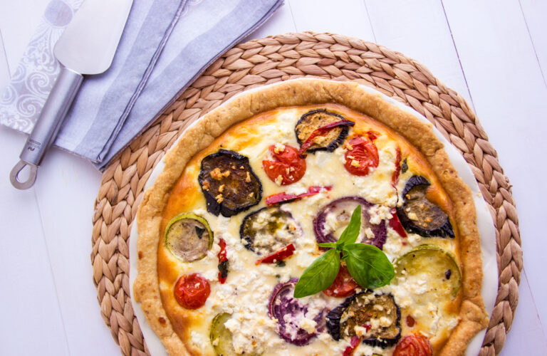 - Reduce oven to 325° F / 160° C. Mush the garlic with a bit of salt to form a paste and slowly whisk in the cream and the eggs, season with salt and pepper. Mix the basil with the vegetables and spread ⅔ of them in the baked shell. Crumble ¾ of the goat’s cheese on top and pour over the cream mixture. Top with the rest of the vegetables and cheese. Bake for 45-50 mins until the quiche is just set with a slight wobble in the center. Serve warm or cold, topped with few basil leaves and toasted pine nuts.
