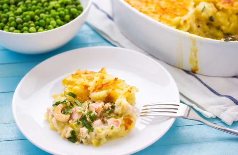Sophisticated fish pie made of salmon filet and shrimps, cooked in creamy white sauce under a blanket of fluffy potato mash. You can even prepare it a day ahead and bake it just before serving.