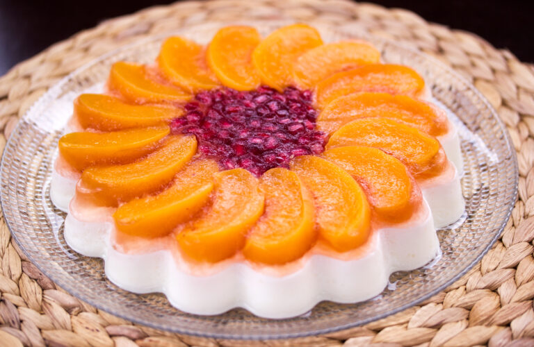 - Take a silicon mold or 9″ / 23 cm cake pan, oiled with a bit of vegetable oil. Lay out slices of peaches and pomegranate seeds. Cover them with the gelatin mixture and freeze for 1 hour.